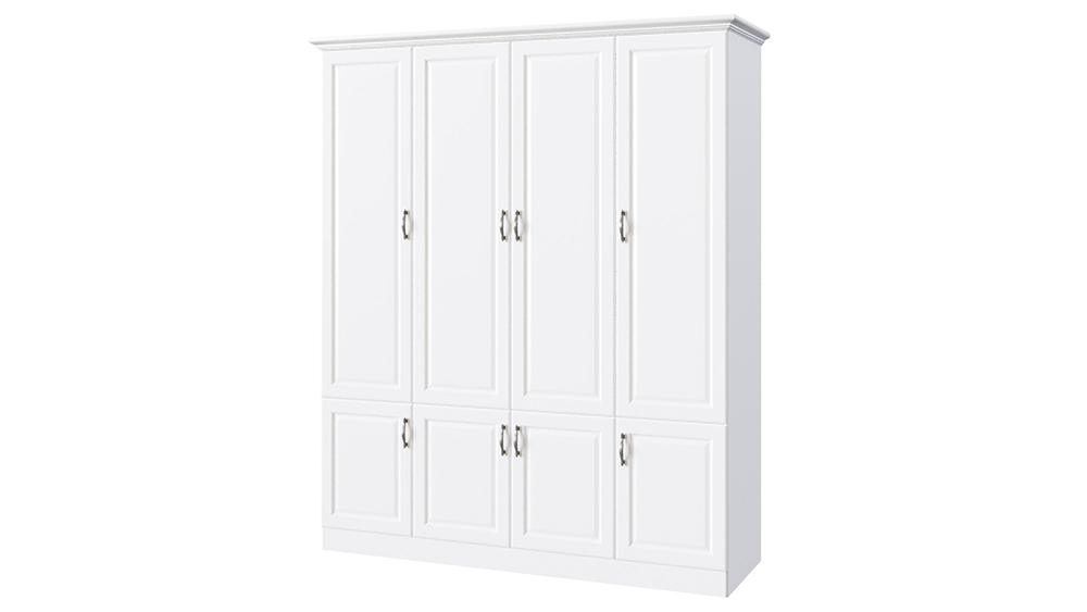 Классический шкаф, созданный в едином стиле с коллекцией Эдем — изделие без которого не возможно себе представить спальню. Корпус шкафа может быть изготовлен как из массива бука и ясеня, так и из массива мягколиственных пород, что делает его стоимость еще более демократичной. Четырех створчатый шкаф имеет 3 базовые комплектации: c антресольной секцией в верхней (4-3) или нижней части (4-1) шкафа или двумя выкатными ящиками (4-2) в нижней части шкафа. В стандартном оснащении двух створчатая секция шкафа располагается по центру шкафа и имеет два выкатных ящика. Фасады шкафа могут иметь встроенные зеркала, как на лицевой части фасада — по размеру филенчатой части, так и на внутренней стороне фасада. Распашные дверцы шкафа оснащены петлями с системой до-закрытия в базовой комплектации. В широкой центральной секции шкафа предусмотрена штанга для плечиков, а в малых секциях предусмотрены полки для хранения вещей. По желанию шкаф может быть оснащен любым количеством полок.